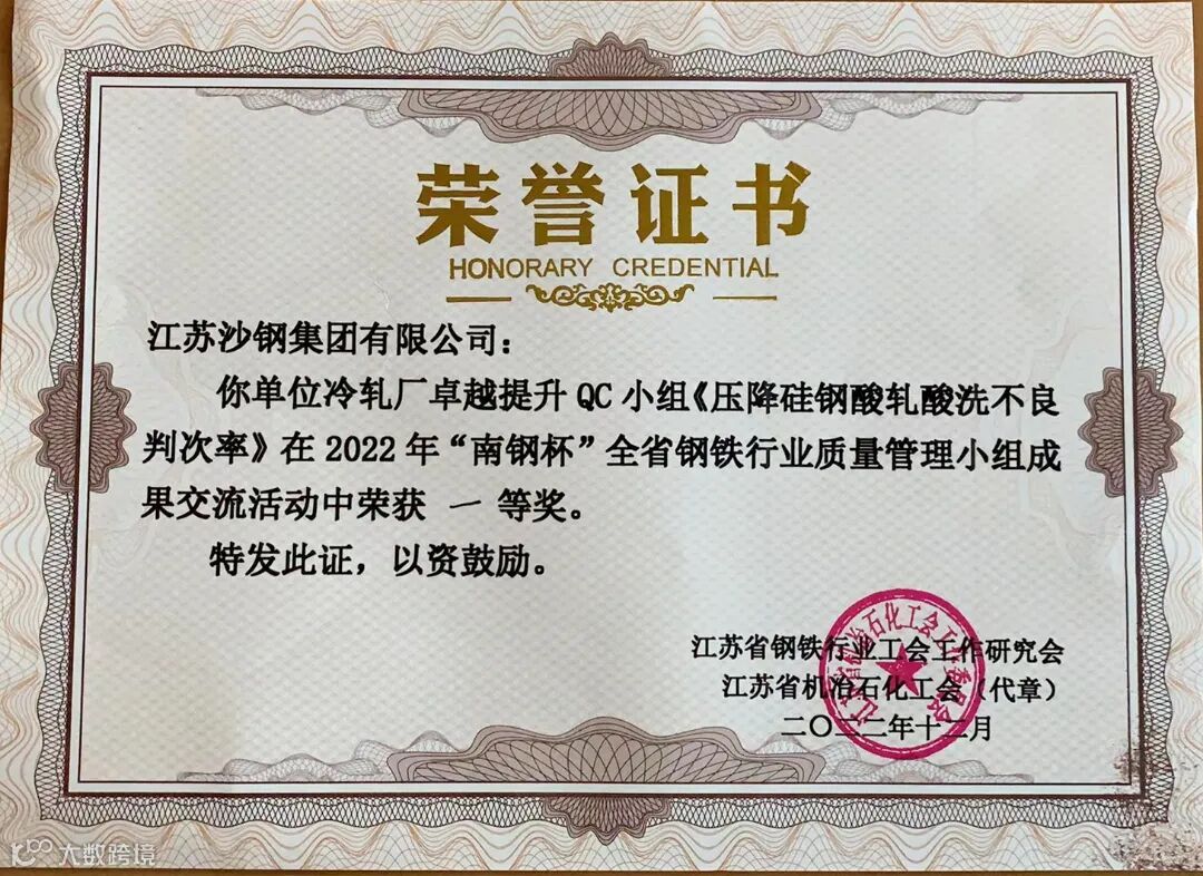 《压降硅钢酸轧酸洗不良判次率》课题背景是沙钢冷轧的拳头产品无取向硅钢,QC小组全体成员运用科学的工具,找到了影响硅钢酸轧酸洗不良判次率高的要因,针对性制定措施,大大压降了硅钢酸轧酸洗不良判次率。项目进一步提升了沙钢硅钢产品质量水平和品牌形象,为冷轧硅钢产品稳定立足市场打下坚实基础。
