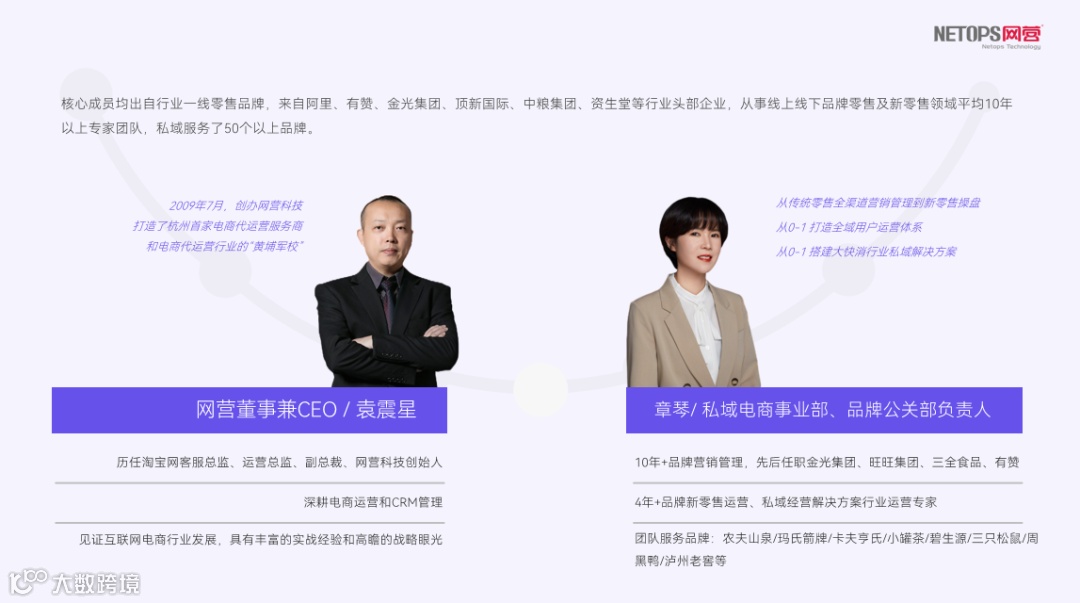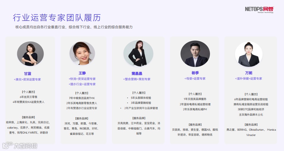 网营私域团队核心成员,均来自中粮集团、金光集团、丝芙兰、旺旺、燕之屋等国内外一线品牌,聚焦食品保健、酒水饮料、母婴、美妆、宠物5大核心行业,操盘近100个品牌,打造了多个现象级案例。