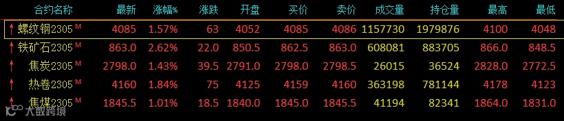 2月9日,今日钢价小幅上涨为主。螺纹涨63收4085,热卷涨75收4160,铁矿石涨22收863,焦炭涨39.5收2798。