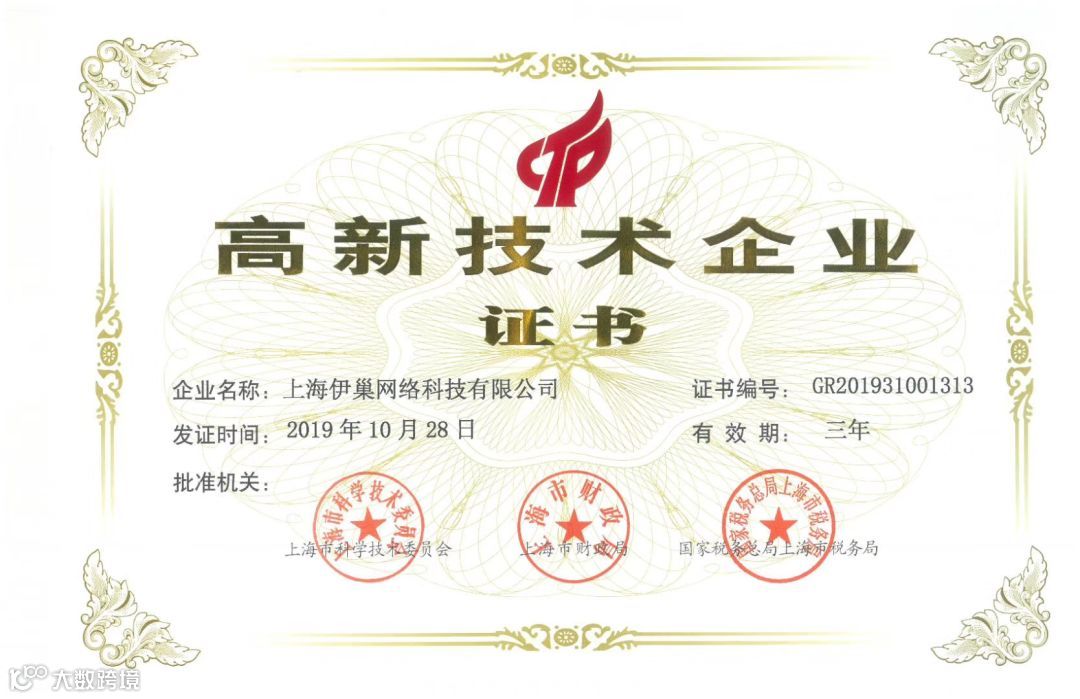 近日,上海伊巢网络科技有限公司收到上海市科学技术委员会、上海市财政局、国家税务总局上海市税务局联合颁发的《高新技术企业证书》,公司被认定为高新技术企业,发证时间为2019年10月28日,有效期为三年。
