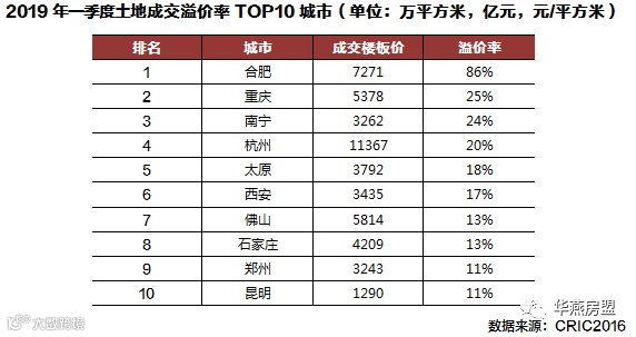 2019年一季度,土地溢价率终结了长久以来的低位徘徊,迎来明显回升,其中合肥、重庆、南宁、杭州等二线城市,竞拍热度较高,市场重塑信心。特别是合肥,近来出让地块的溢价率有多宗都在100%以上,一季度平均溢价率达到86%。