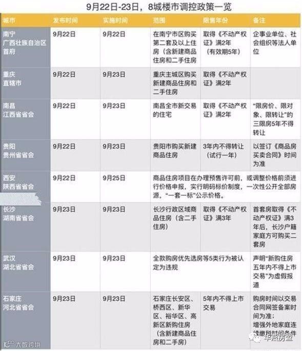 自上周五以来,西安、重庆、南昌、南宁、长沙、贵阳和石家庄等城市先后出台楼市调控新政,重点都放在“限售”之上,其中重庆和南昌要求新购住房取得不动产权证满两年后才能上市交易;南宁要求在市区(不含武鸣区)购买第二套及以上住房,须证过两年(即取得不动产权属证书两年)方可转让;长沙要求购房满3年方可交易,贵阳也要求购买新建商品住房3年内限制转让;石家庄要求新购住房及二手房5年内不得上市交易。此外,西安还发布了商品房价格调控通知。