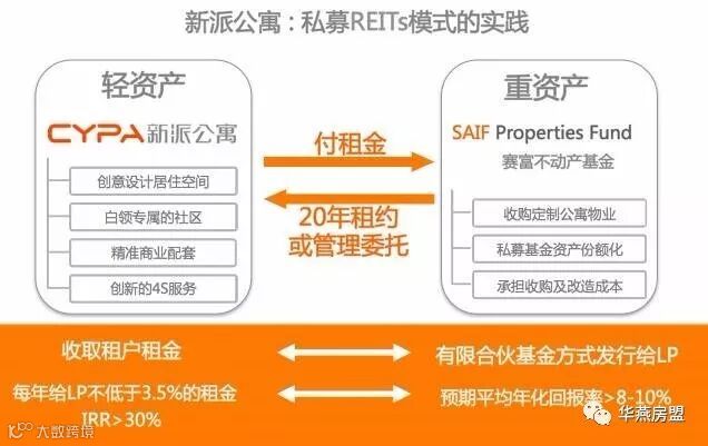 新派公寓在成立运营品牌之初,便按照一个类REITs模式做了轻重资产配合的系统架构,通过成立私募资产基金,引入机构及个人投资,以私募的形式购买物业,并以租金分红的形式将收益返还给投资人,新派公寓自身投入很少。具体来说,就是和赛富基金一起发起了赛富不动产基金,收购或整租、改造目标物业,新派公寓则负责物业的出租经营与管理,所有装修改造成本由基金承担,这种模式能让新派公寓实现真正的轻资产运营,为后期的资产标准化与迅速规模化奠定基础,通过品牌培育、管理输出,可以在长期持有经营中获取稳定收益。而且重资产的基金也透过新派每年的稳定租金分红以及资产预期增值来获益,达到双赢的格局。