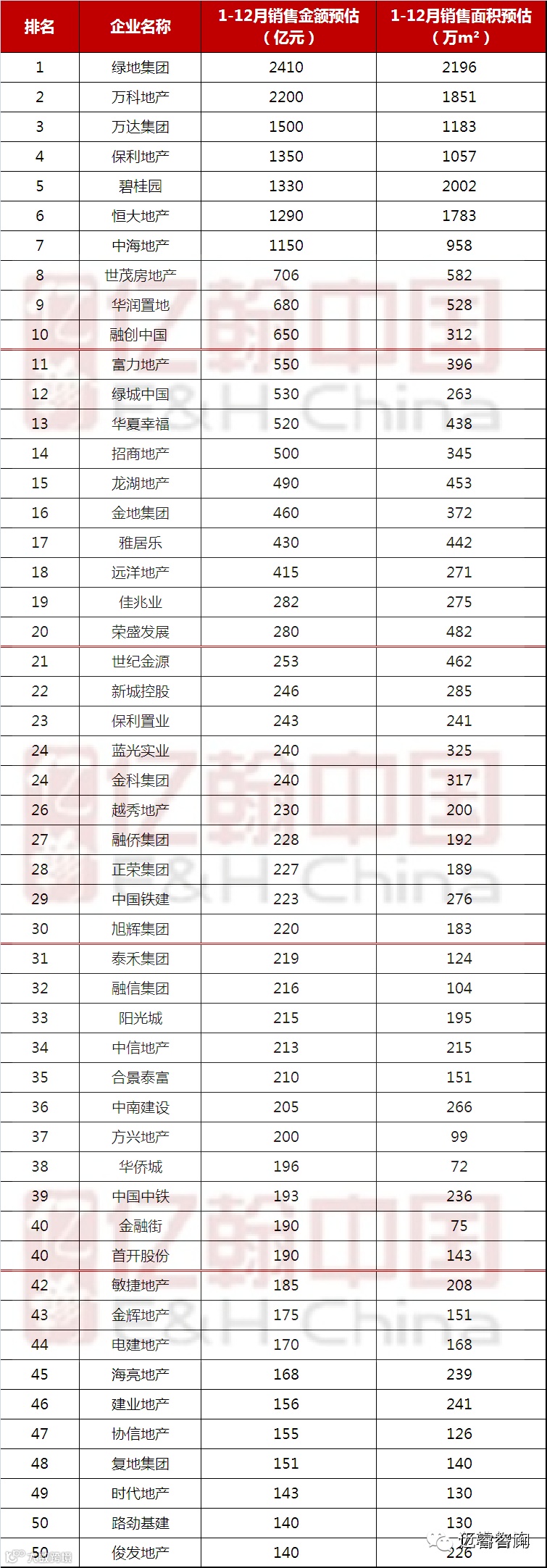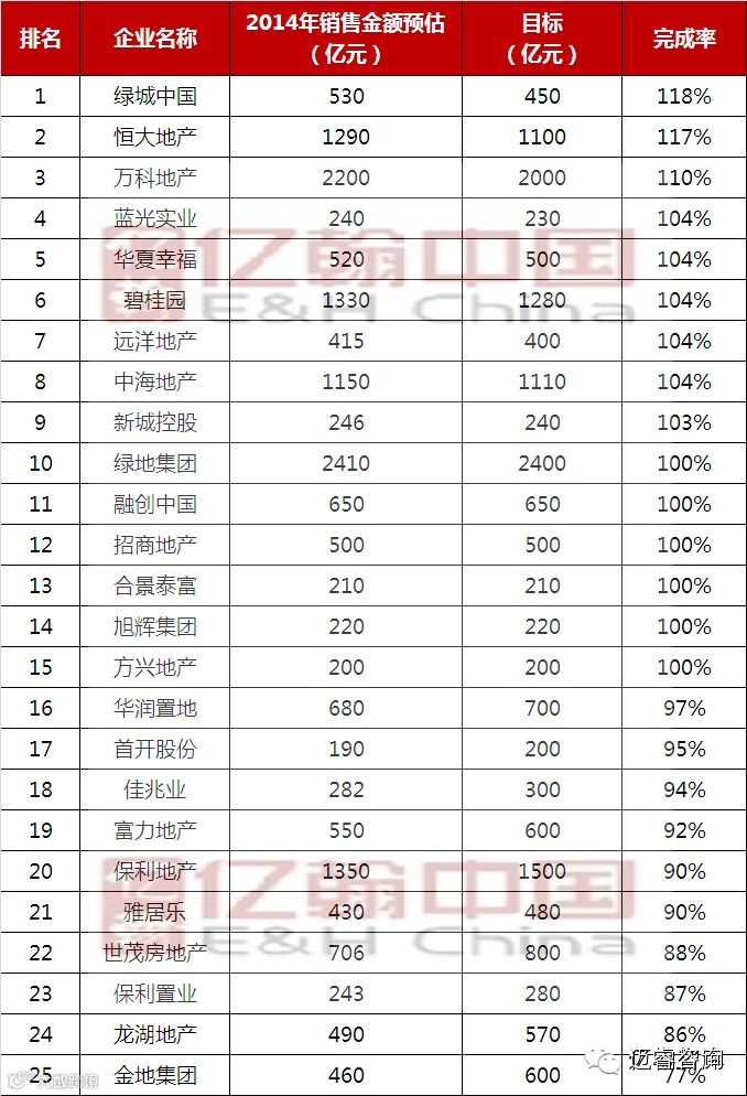 整体来看,房企销售前50前门槛由2013年100亿提升至140亿,2014年虽然整体市场进入调整期,但是中央与地方政府大力救市,使得行业没有出现大幅下滑,多数房企全年业绩同比增加。