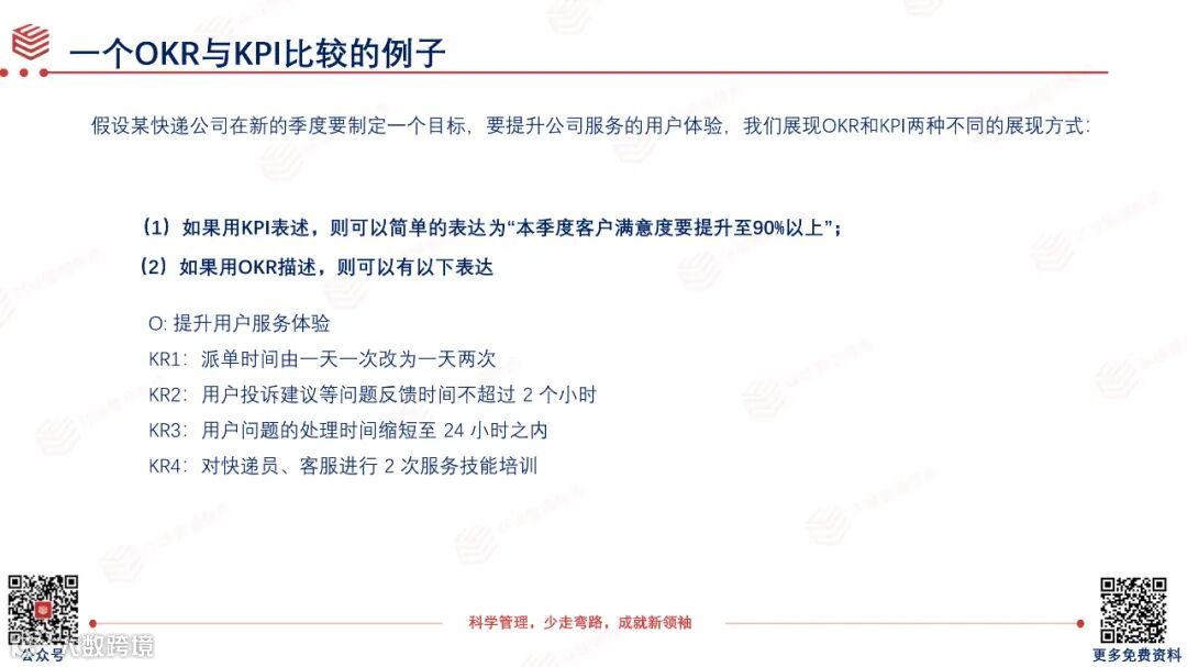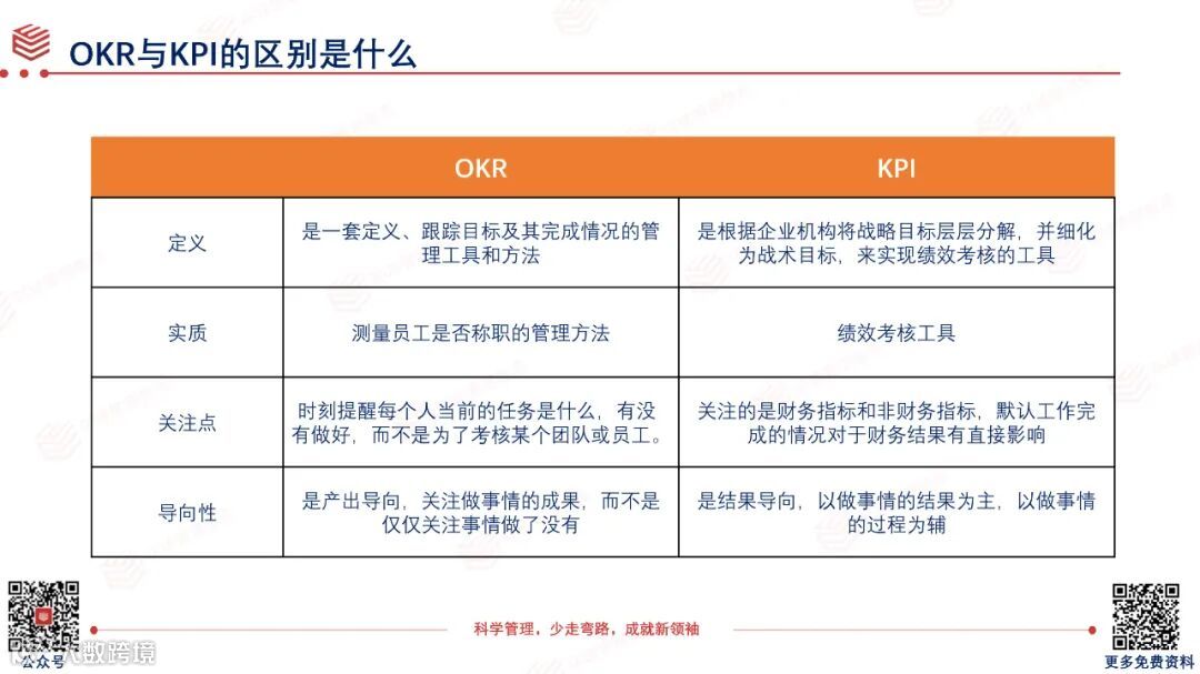 OKR与SMART的区别:OKR仍然强调具体、可衡量、相关联、有明确时间,但不强调可实现,而强调有雄心的。