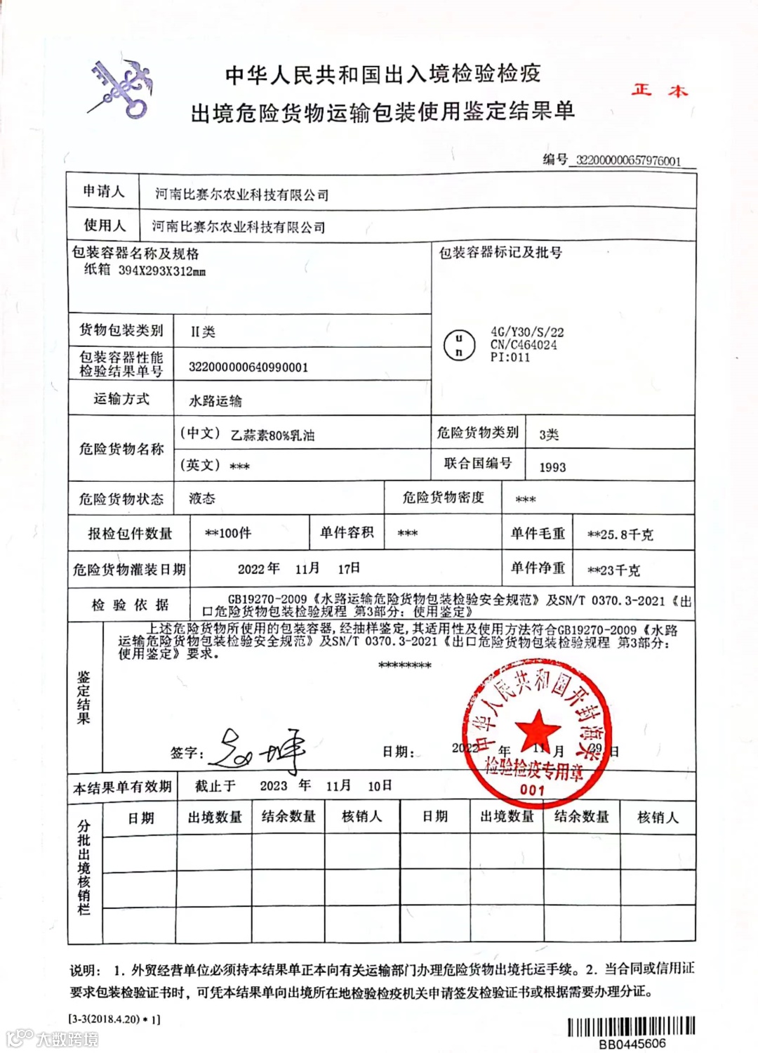 近日,由东南亚企业向我司定制采购的80%乙蒜素,经由开封海关备案和中华人民共和国出入境检验检疫中心产品鉴定之后,已顺利运抵菲律宾。此举也标志着比赛尔集团在2022年第四季度的出口业绩再创新高。