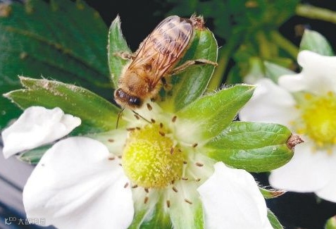 草莓属自花授粉,但异花授粉能显著提高产量和质量。可通过放蜂、花期通风、人工点授和品种搭配栽培等措施加大异花授粉机率。一般每亩日光温室放1-2箱蜜蜂,蜜蜂总数在1万-2万只,保证一株草莓有一只以上的蜜蜂,也可用毛笔在上午10时以后在开放的花上涂几下,使开裂花蕊中的花粉均匀洒落到整个花托上。或用扇子扇植株上的花朵等方式均可进行辅助授粉。