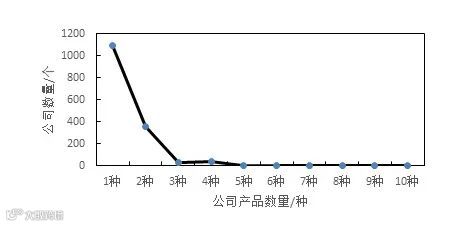 各公司产品数量分布折线图全国1537家企业中,产品低于两种的企业数量达1450家,占比94.3%,产品数量超过5种的更是只有不到20家。其中前五包括山东农大肥业科技有限公司、史丹利农业集团股份有限公司、山东庞大生物集团有限公司、山东恩宝生物科技有限公司、山东土秀才生物科技有限公司,前十中有多家上市企业,规模相对较大。