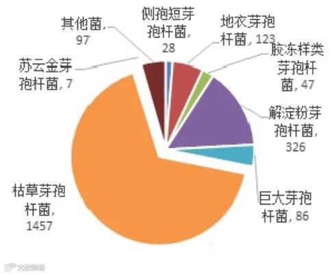菌种上面,已明确菌种的产品有2171个,其中菌种有214种(类),含混合菌种。在生物有机肥的菌种中,目前以芽孢杆菌属的生物有机肥居多,有2074种,占比95.5%。其中巨大芽孢杆菌可释放土壤中难溶磷,胶冻样(胶质)芽孢杆菌可释放土壤中的矿物钾;其他菌种可以起到一定作用的促生、拮抗作用