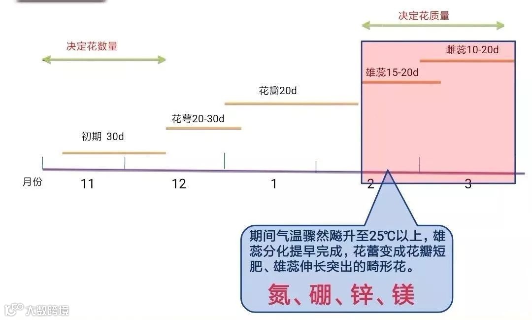 如上图所示,花芽生理分化完成后,就是漫长的形态分化过程,从形态分化前期、花萼分化期、花瓣分化期到雄蕊分化期、雌蕊分化期。整个过程从11月中下旬到次年开花前(3月)。而花芽的形态分化期也就是通常所说的花芽分化期。