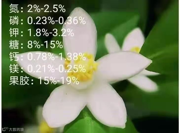 据科学研究分析证明:成熟柑橘花的营养干物含量分别为:柑橘花含有N、P、K各为2%,10000朵花重量有一千克,N、K各约有20克。
