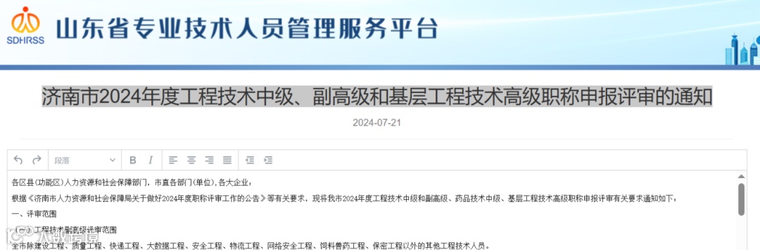 6.《济南市人力资源和社会保障局关于做好2024年度职称评审工作的公告》(http://jnhrss.jinan.gov.cn/art/2024/7/8/art_18578_4801350.html)