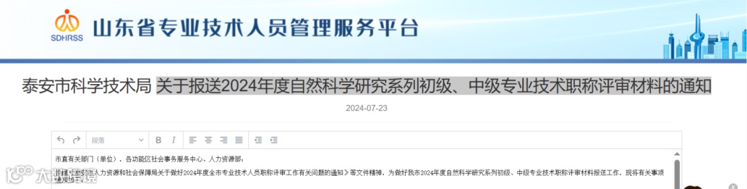 7月23日泰安市科学技术局发布了《关于报送2024年度自然科学研究系列初级、中级专业技术职称评审材料的通知》