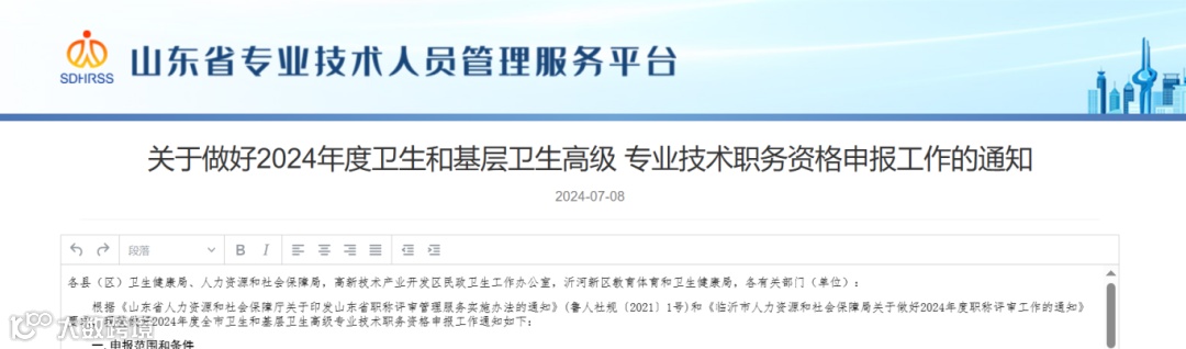 7月8号临沂市卫生健康委员会发布了《关于做好2024年度卫生和基层卫生高级 专业技术职务资格申报工作的通知》