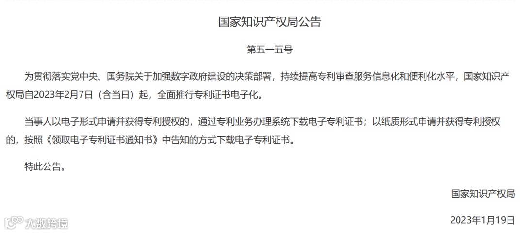 导读:关于全面推行专利证书电子化的公告