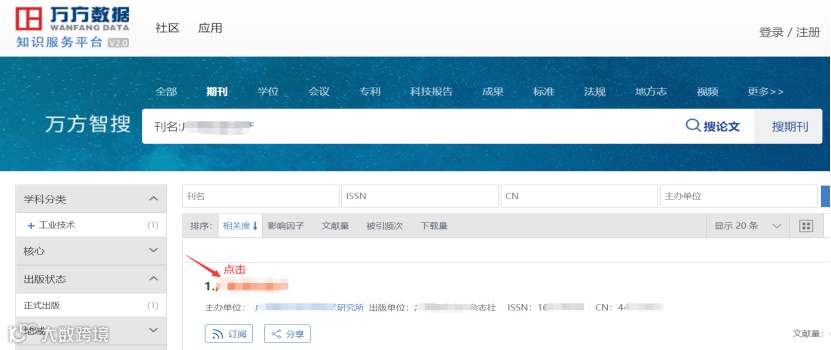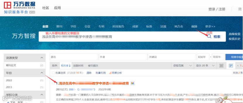 在搜索框中输入你要检索的文章题目,点击后方的检索或按