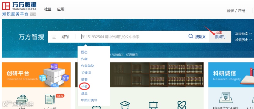 3、在搜索框中选择刊名,输入自己所发表的期刊名称,点击后方搜期刊或是按