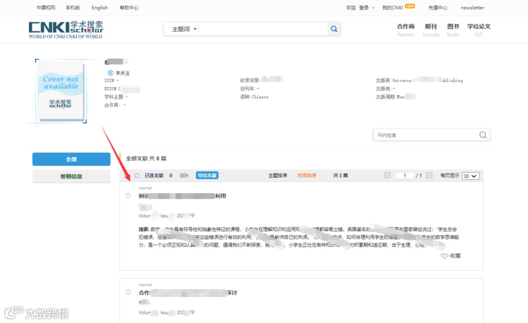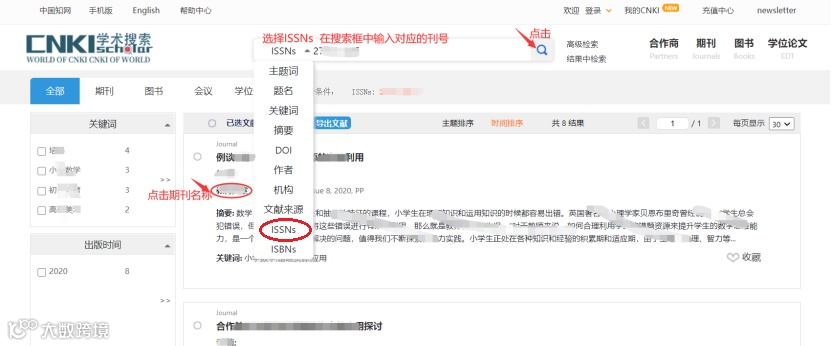 2、选择ISSNs,在搜索框中输入你所发表的期刊对应的刊号,点击放大镜或按enter键。可以在此页面中查找有无自己想要查找的文章,也可以点击期刊名称,进入下一页面查找。