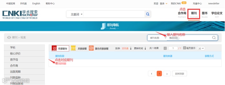 3、或是点击期刊,输入期刊名称,点击对应期刊,进入期刊页面进行查找。