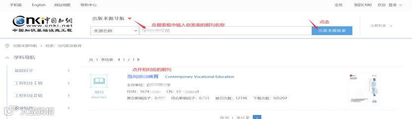 3、在搜索框中输入自己所发表的期刊名称,点击出版来源检索或按enter键,找到相对应的期刊并点开。