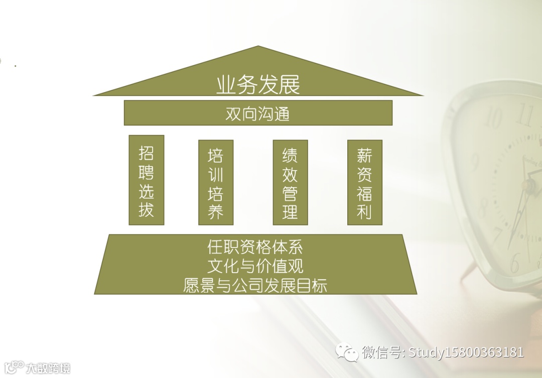 所有的发展必须建立在公司的企业文化的基础上,基于公司的愿景与公司发展目标,文化与价值体系,任职资格体系.在此基础上进行:招聘选拔、培训培养、绩效管理、薪资福利等.在双向沟通的同时,促进公司业务的发展.