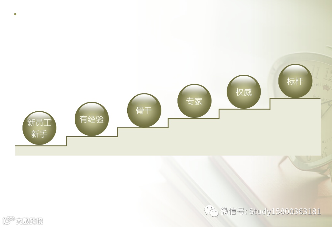 作为一个新手,新员工入职公司,慢慢有经验后,可以成为公司的骨干,进一步的学习后可以成为专家.不断的学习进修,可以成为一种权威,最后成行业的内的标杆.