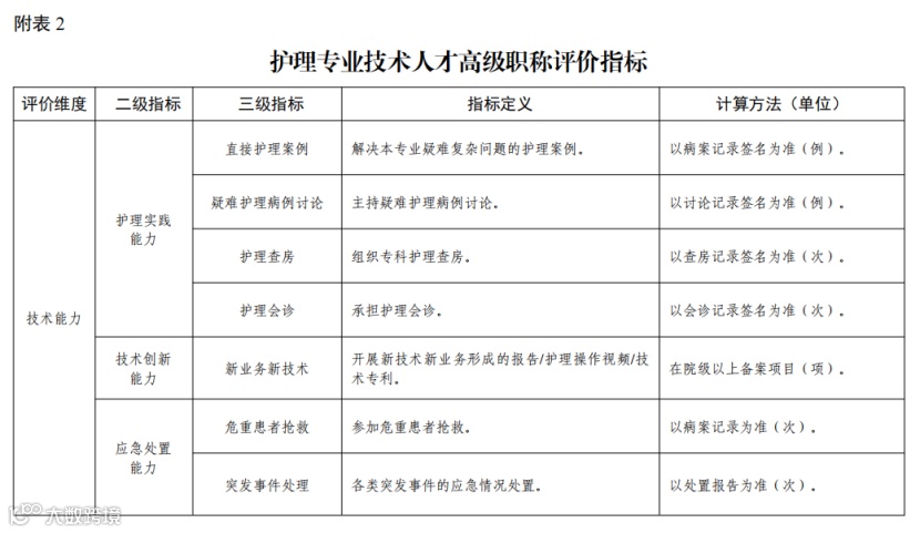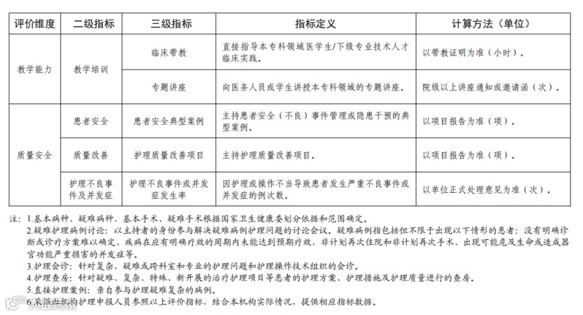 (3)重点从技术能力、教学能力、质量安全等维度进行评价,将护理实践次数、技术创新项目数、应急处置次数、教学培训时长、患者安全案例、质量改善项目数及护理并发症发生例次等作为重要评价指标,具体见附表2。