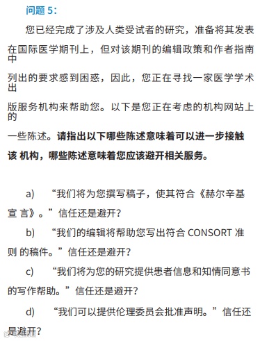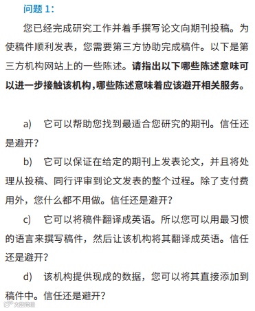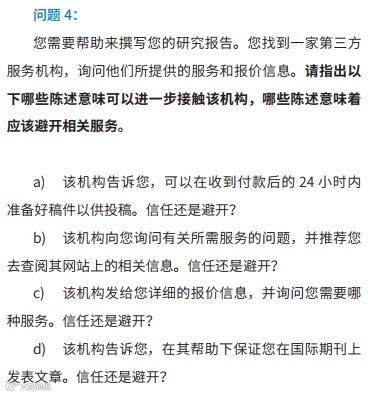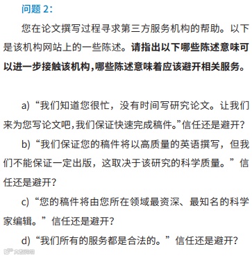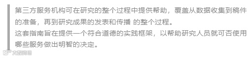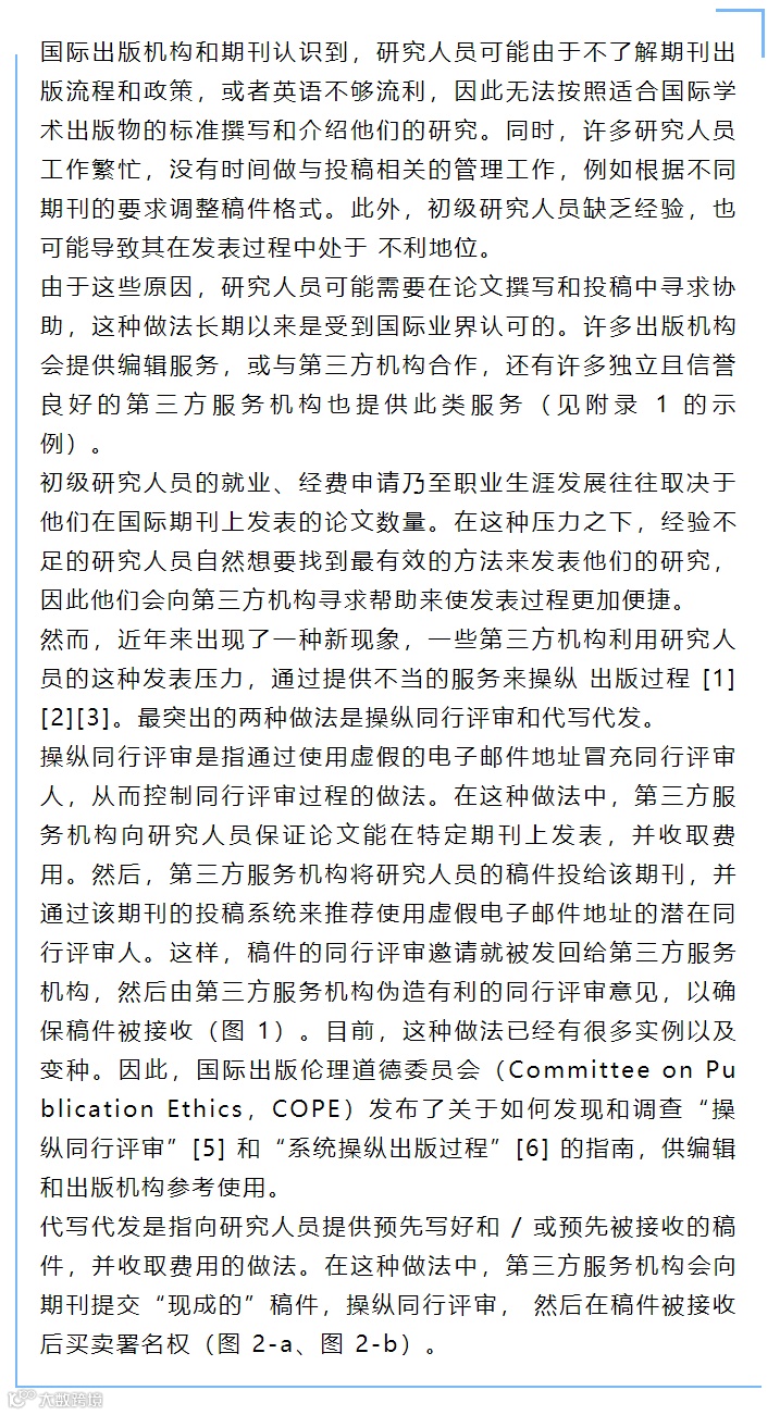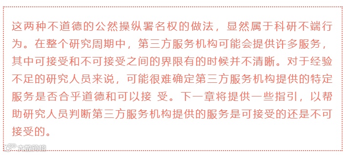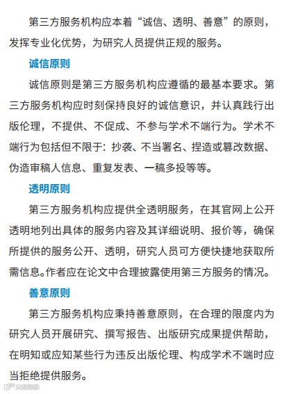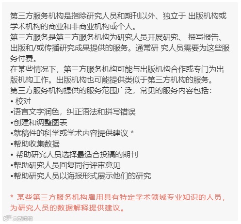 信誉良好的第三方服务机构,因其规范的服务,提升了研究人员的工作成果被出版方接受、发表的机会。他们公示服务的内容,不会提供未经公示的服务,也不会保证论文被接受发表。研究人员应当避开任何旨在规避正常同行评审过程或是提供不体现研究人员自身工作的预写(代 写)数据、图表或稿件的服务。