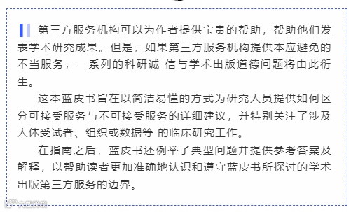 第三方服务机构为经验不足和非英语母语的研究人员在国际学术界传播其工作提供了重要而有价值的服务。然而,研究人员也应该意识到,尽管第三方服务机构的使用被接受已经很长时间了,但某些机构提供的某些服务并不符合最佳学术研究成果发表和出版实践,应避免使用。