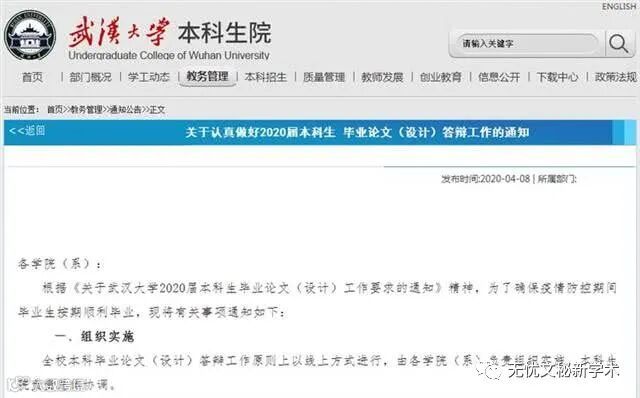 近日,武汉大学本科生院发布了《关于认真做好2020届本科生毕业论文(设计)答辩工作的通知》,内容如下: