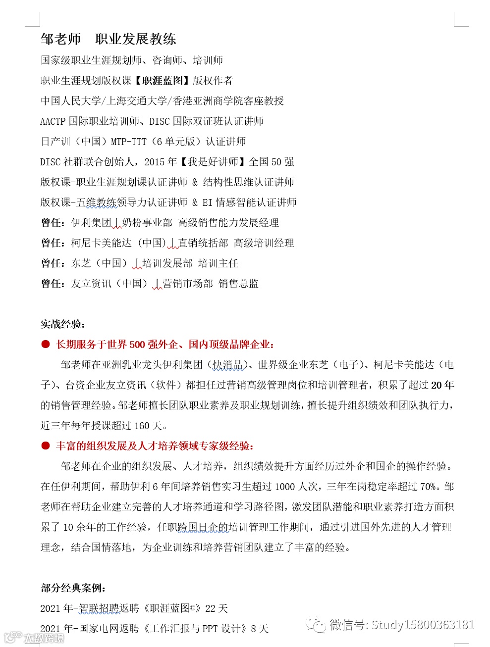 师资优选:   职业发展教练_邹老师 上海企训企管