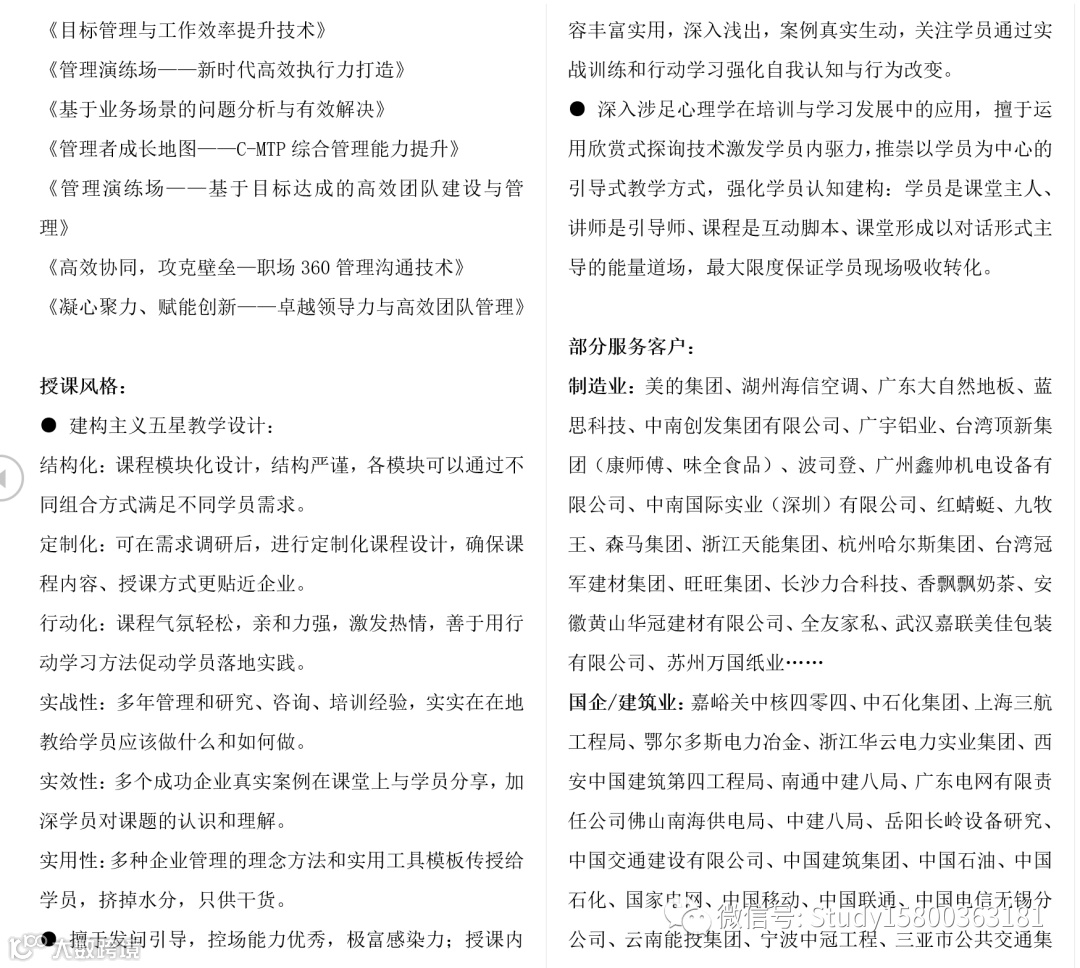 导读:师资简介师资行业目录001. 生产管理( 80位+)师资表获取,请回复:601002. 人力资源(80位+)