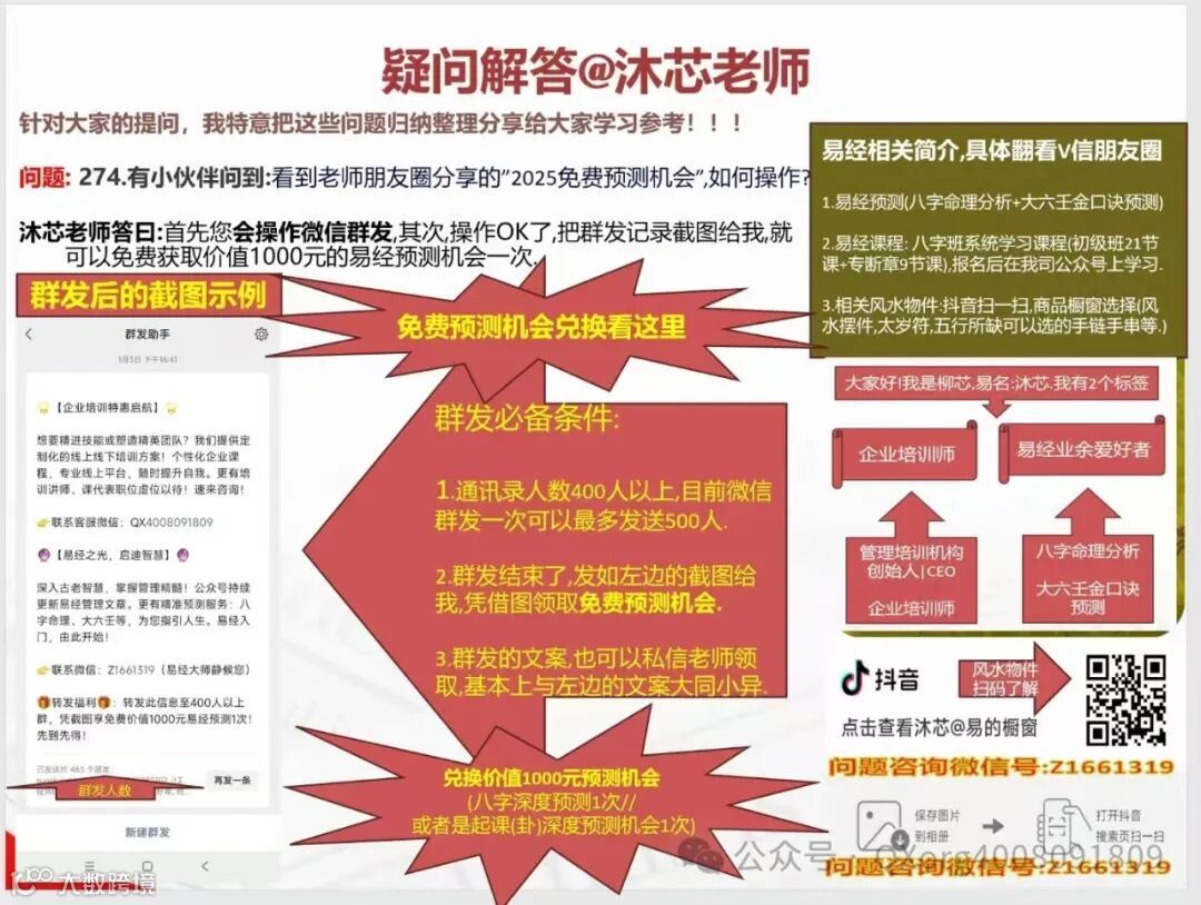 在微信中通过微通讯录向400位以上的好友进行群发消息,并凭群发截图兑换价值1000元的免费预测机会一次。这里所说的“微通讯录群发好友”,指的是利用微信内置的功能,从您的微信通讯录中选择联系人并发送统一的消息给选定的联系人群体。请注意,这不同于微信群聊中的消息发送,而是直接向个人发送消息的一种方式。此1000元的预测机会可以兑换为八字深度预测1次或起课(卦)深度分析1次.