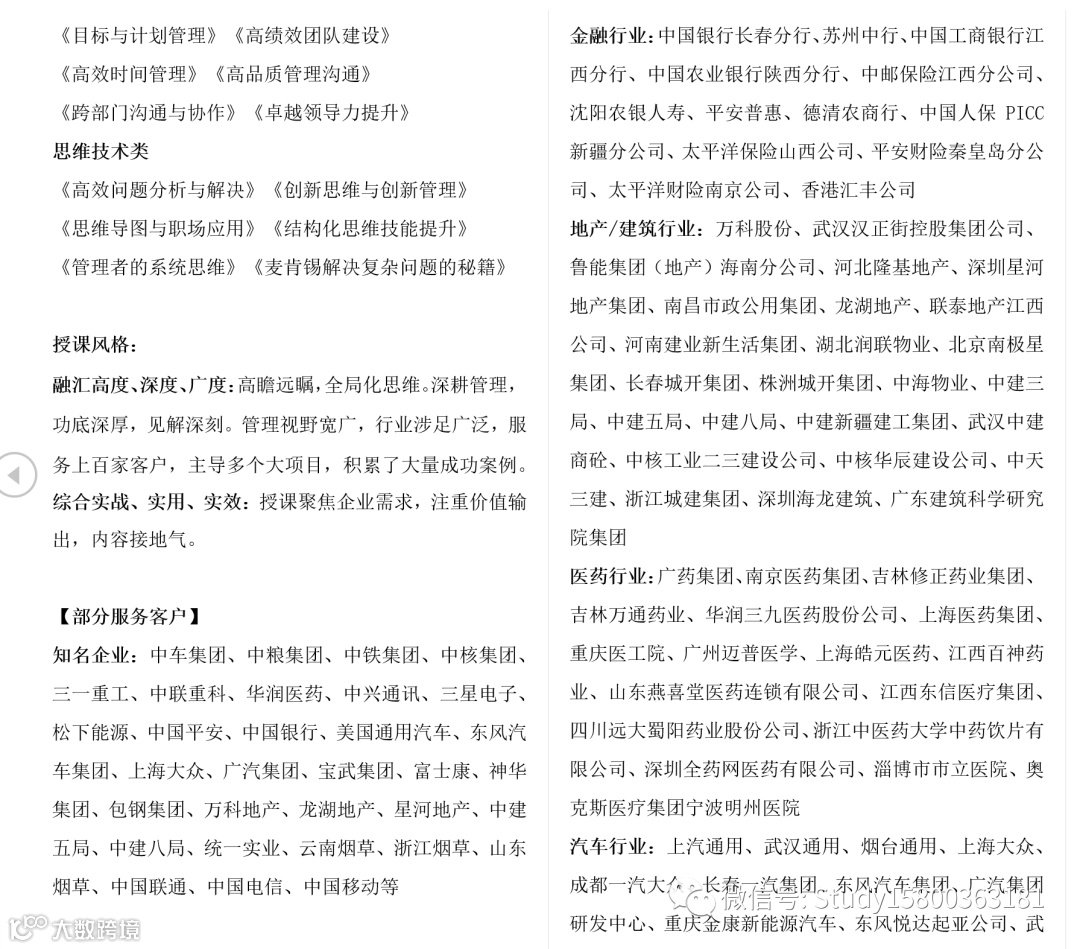 导读:师资简介师资行业目录001. 生产管理( 80位+)师资表获取,请回复:601002. 人力资源(80位+)