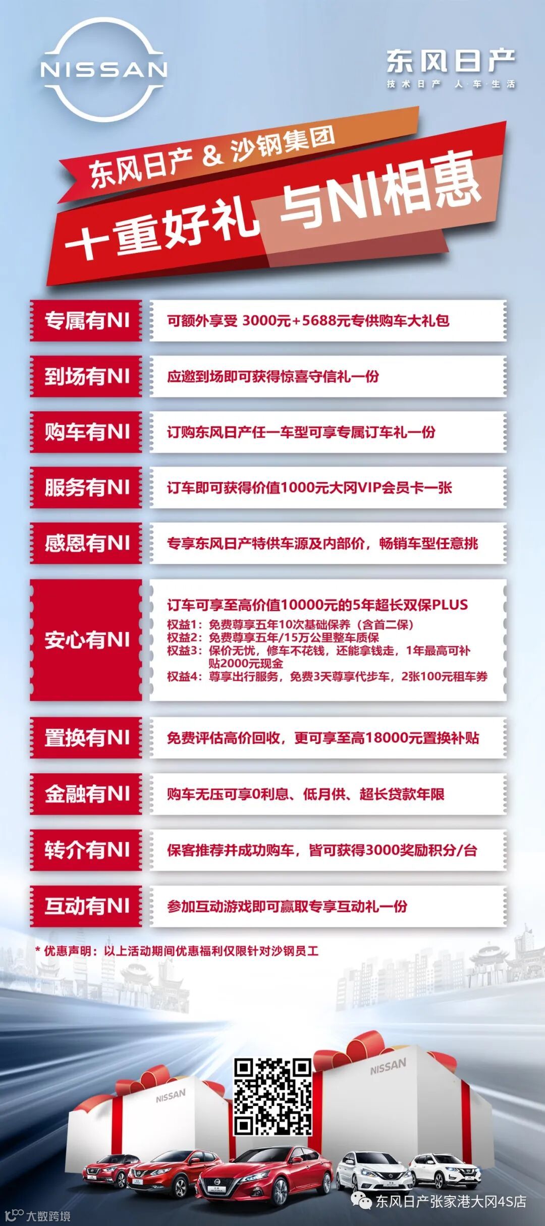 5月28日-30日东风日产最新的智能展厅3.0&互动体验设备首次亮相张家港,入驻沙钢体育馆广场,品牌焕新后带给沙钢员工最新的体验,并带着定制的优惠政策送福利来啦!