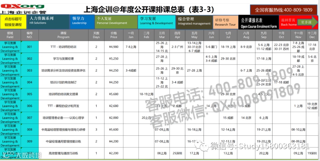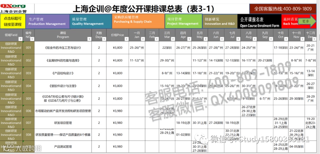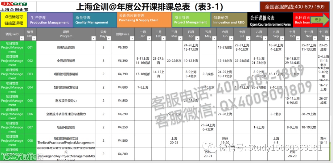 我司联合各培训机构主办或联合举办,招生以下主题的公开课.开课城市一线城市居多,比如:北京\上海\广州\深圳\南京\杭州\苏州\厦门\成都等居多,课程一般是2-3天的课程.也有1天的课程,也有短期5-7天的课程.更多问题咨询了解请联系客服微信:QX4008091809,客服热线:4008091809