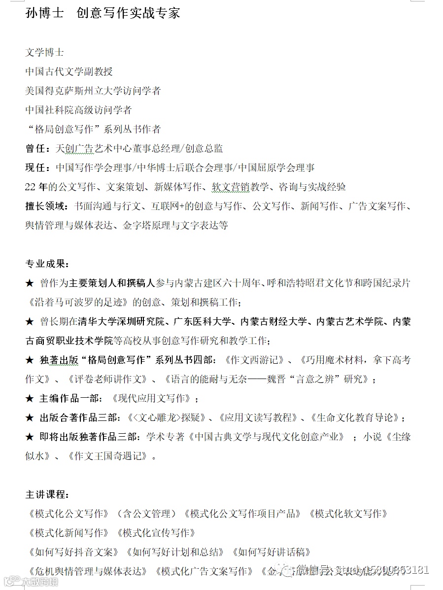 师资优选:  创意写作实战专家_孙老师 上海企训企管