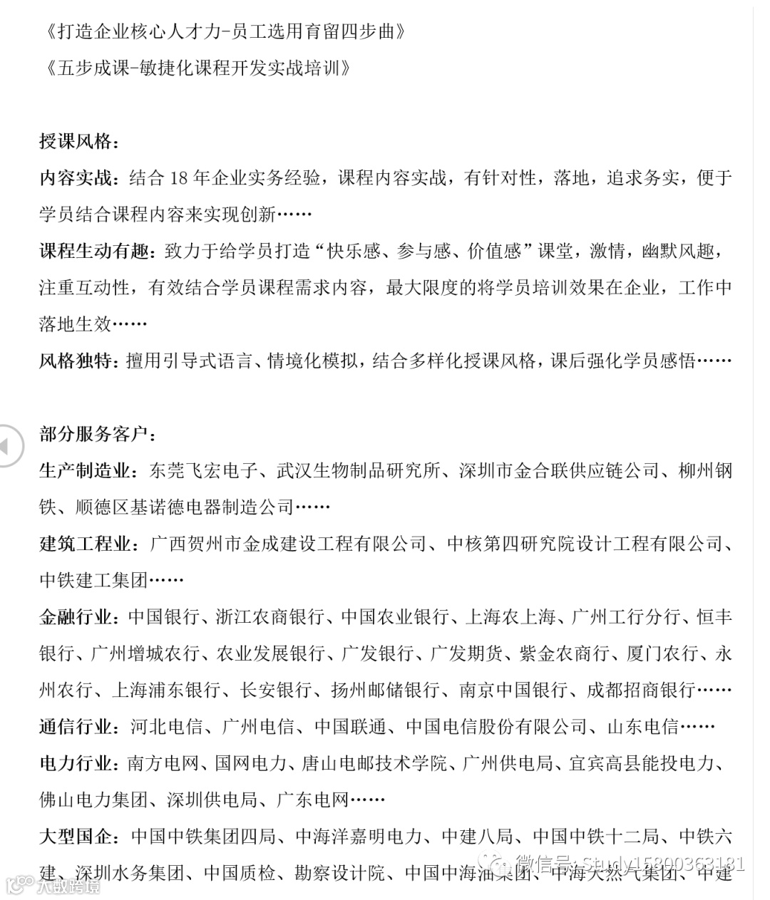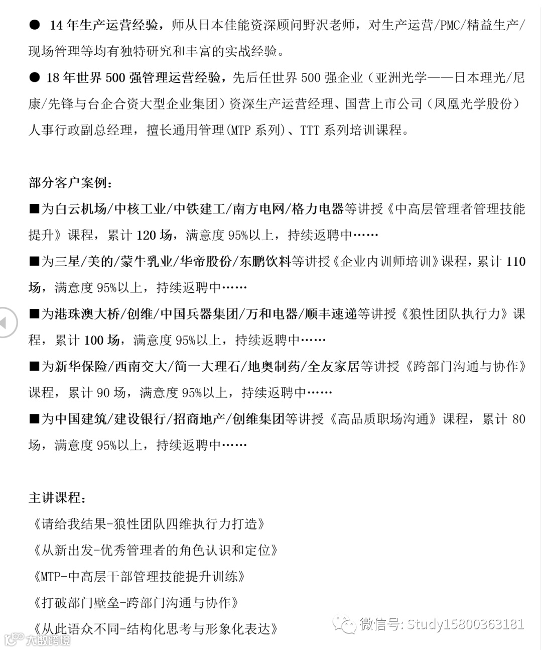 导读:师资简介师资行业目录001. 生产管理( 80位+)师资表获取,请回复:601002. 人力资源(80位+)