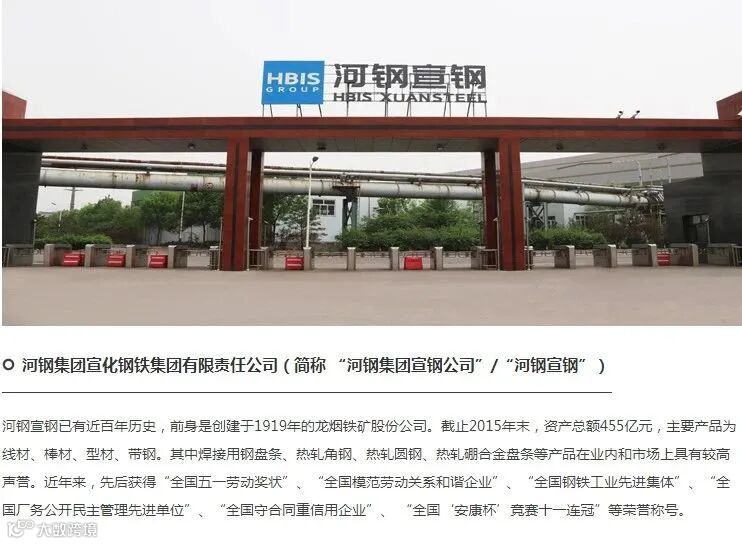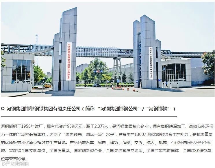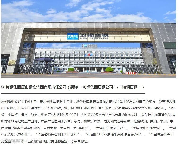 河钢集团组建于2008年6月,旗下钢铁子公司大多有着数十年乃至上百年历史。河钢集团是由我国两大钢铁集团--唐钢集团、邯钢集团强强联合组建而成的国内最大、全球第二的特大型钢铁集团,总资产2638亿元,年产钢4024万吨,截至2019年,河钢在全球拥有员工近12.7万人,其中海外员工1.3万人,实现年营业收入3547亿元,总资产达4621亿元。连续12年位列世界企业500强,2020年居第218位, 在2020年“中国企业500强”、“中国制造业企业500强”、“中国跨国公司100大”排行榜中分别位列第59位、第18位和第35位。拥有唐钢、邯钢、宣钢、承钢、舞钢、矿业、石钢、国贸、财达、衡板、京唐、宣工、燕山大酒店等13个控股或参股子公司,销售总公司、采购总公司两个分公司和钢铁技术研究总院、战略研究院,集团总部坐落在河北省省会石家庄。