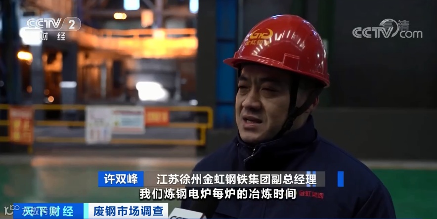 江苏徐州金虹钢铁集团副总经理 许双峰:我们炼钢电炉每炉的冶炼时间在31分钟左右,每天的钢产量大概在3600吨。