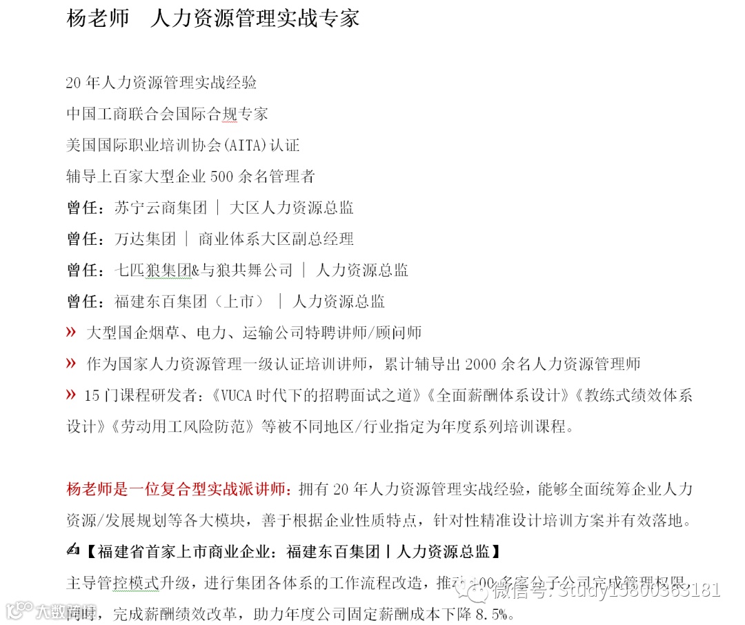 师资优选: 人力资源管理实战_杨老师 上海企训企管