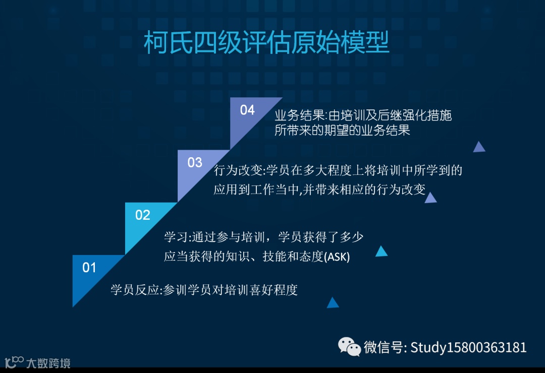 第五层的评估,更加的细化了过程的管理.结果导向,不仅仅要做好过程的管理,对结果也要有一个明确的指标.