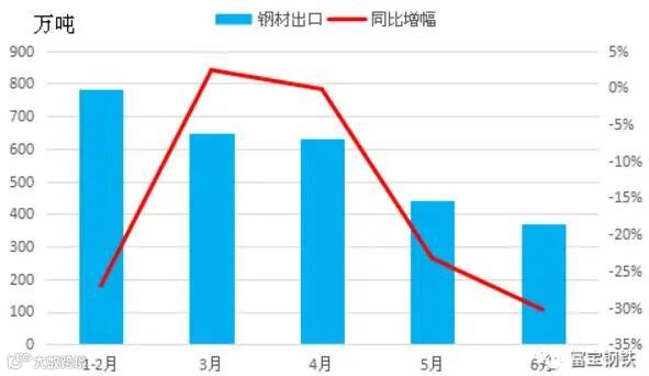 今年上半年我国钢材出口持续下降,尤其5月之后连续两个月出口同比下降23.3%、30.3%,可谓断崖式下滑,这其中主要原因即在于全球疫情严重导致的钢材需求下降,并且,其余国家为保护遭受疫情打击严重的本国钢铁企业,也纷纷打起了反倾销战,对我国钢材出口起到了明显的抑制作用。