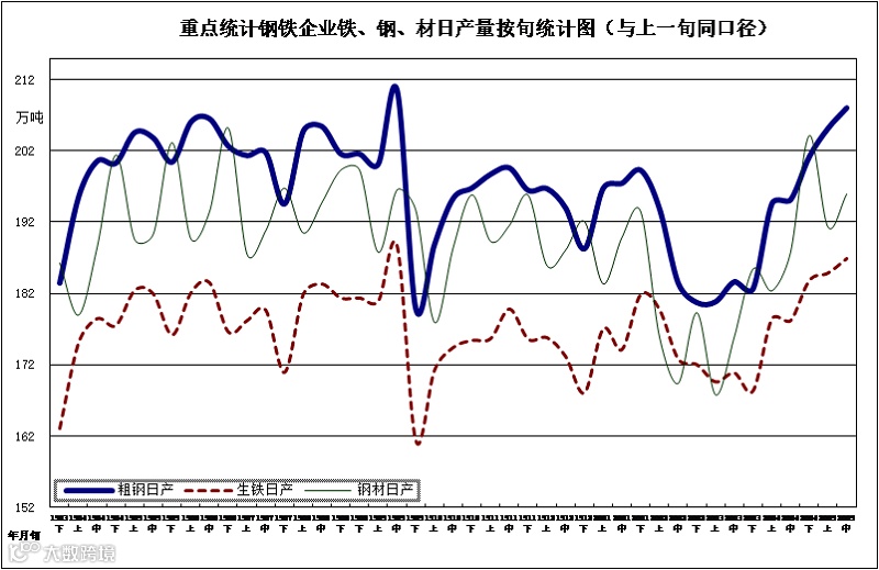 据中钢协统计,2020年5月中旬重点钢企粗钢日均产量208.04万吨,连续5旬环比上升,更创下旬度历史新高。5月全月重点统计钢铁企业累计平均日产粗钢206.60万吨,环比增长6.39%、同比增长1.18%。