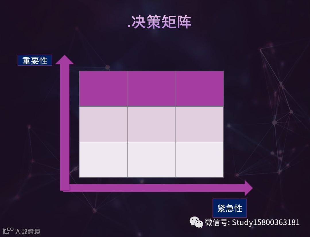 决策矩阵,主要从重要性和紧急性两个维度来考虑,会分出来重要紧急的、重要不紧急的、不重要紧急的、不重要不紧急的.从4个类别来考虑我们的时间事件的安排.