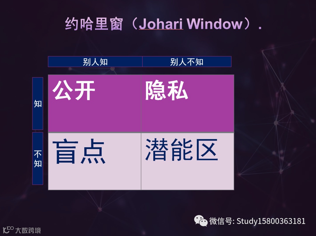 约哈里窗从知道与不知道来分别出别人知道我知道的是公开信息、我知道、别人不知道的是隐私信息、我不知道别人知道的是我的盲点、我不知道别人也不知道的是潜能区.
