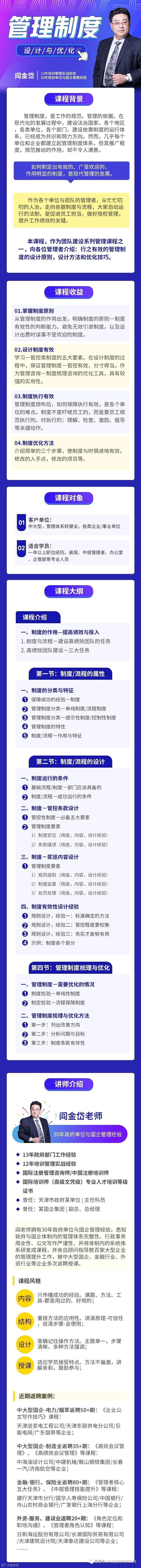 管理制度设计与优化30年政府单位与国企管理经验阎金岱老师【掌握制度原则/设计制度有效/制度执行有效/制度优化方法】向各位管理者介绍:行之有效的管理制度的设计原则,设计方法和优化技巧。帮助管理者制定出有效的、广受欢迎的,作用明显的制度!