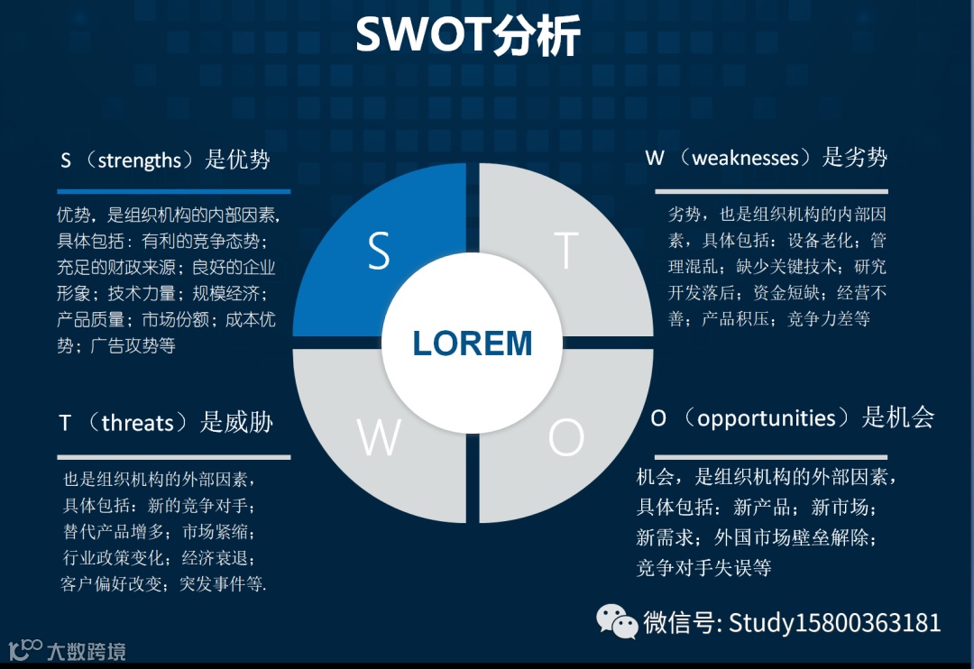 所谓SWOT分析,即基于内外部竞争环境和竞争条件下的态势分析,就是将与研究对象密切相关的各种主要内部优势、劣势和外部的机会和威胁等,通过调查列举出来,并依照矩阵形式排列,然后用系统分析的思想,把各种因素相互匹配起来加以分析,从中得出一系列相应的结论,而结论通常带有一定的决策性.