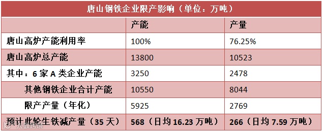 特点2:限产力度较大,根据目前唐山高炉产能利用率76.25%来测算,A类企业由于限产20%,将不受到影响,其他钢铁企业50%限产,影响2769万吨产量,按照35天限产计算,日均减产7.59万吨,共计266万吨。如果以满负荷生产来测算,影响产能达到5925万吨,35天内,减产达到568万吨。因此,限产影响将达到266万吨至568万吨。