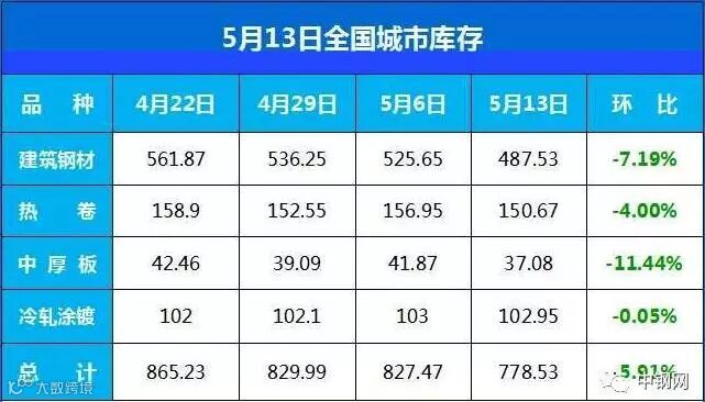 今日库存数据显示,全国城市库存数据继续呈现下降之势,建材、热卷、中厚板、冷轧涂镀等主流品种库存合计下降5.91%,其中中厚板和建材降幅较大,热卷降幅较小。
